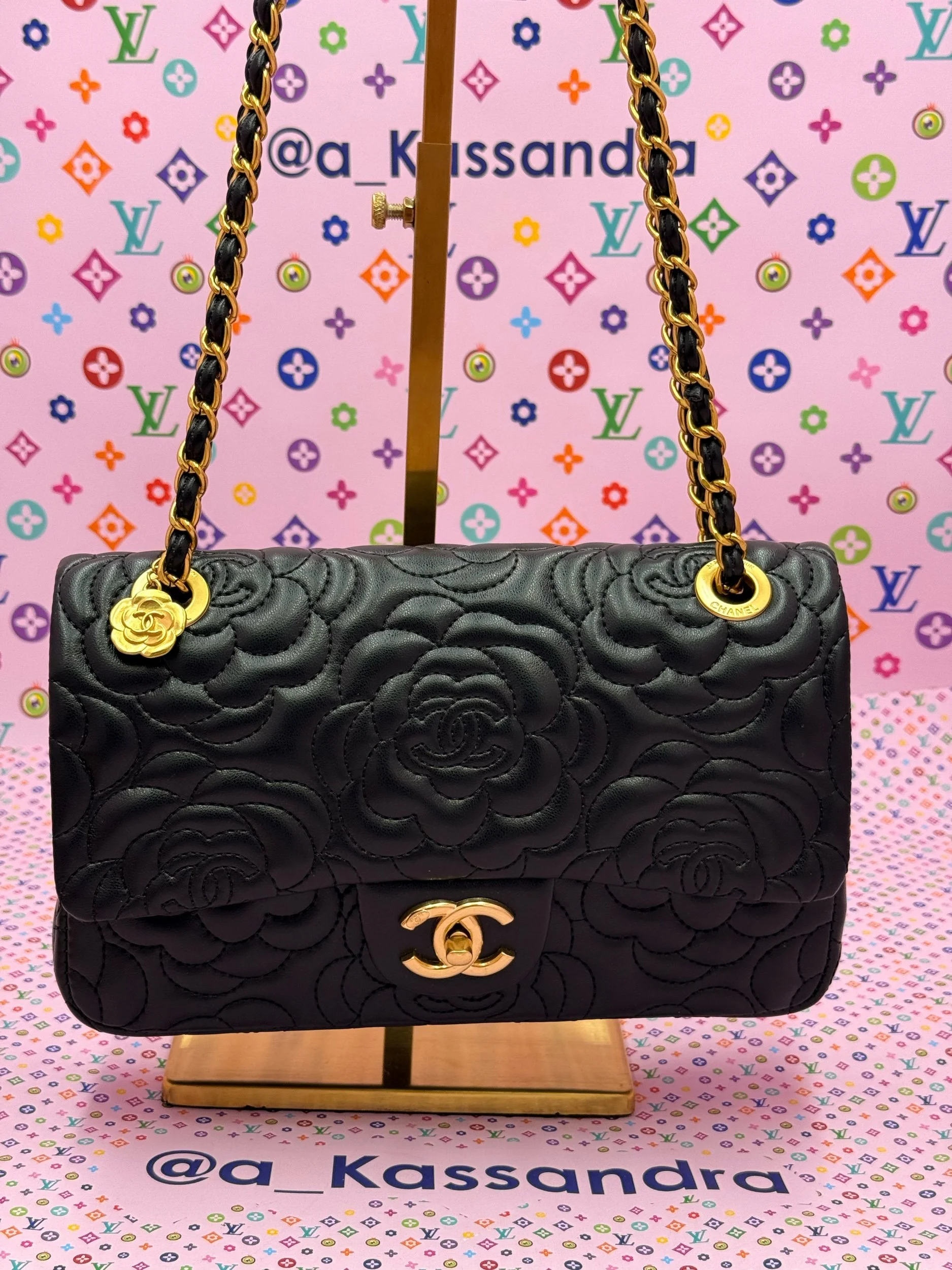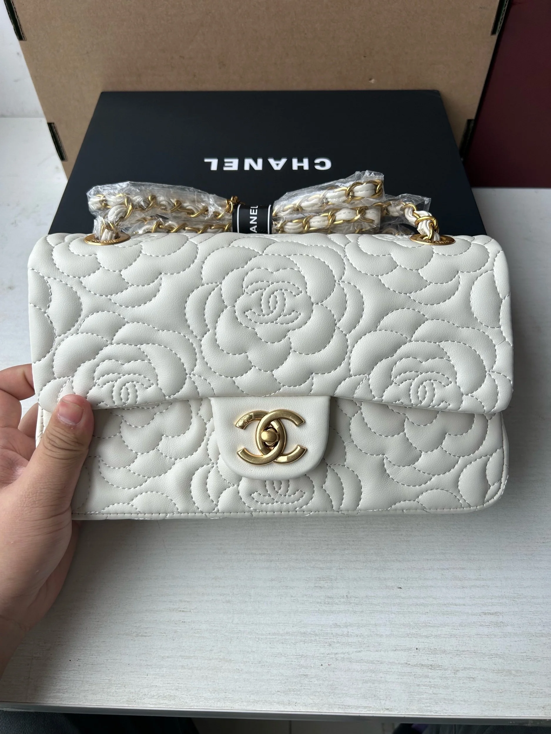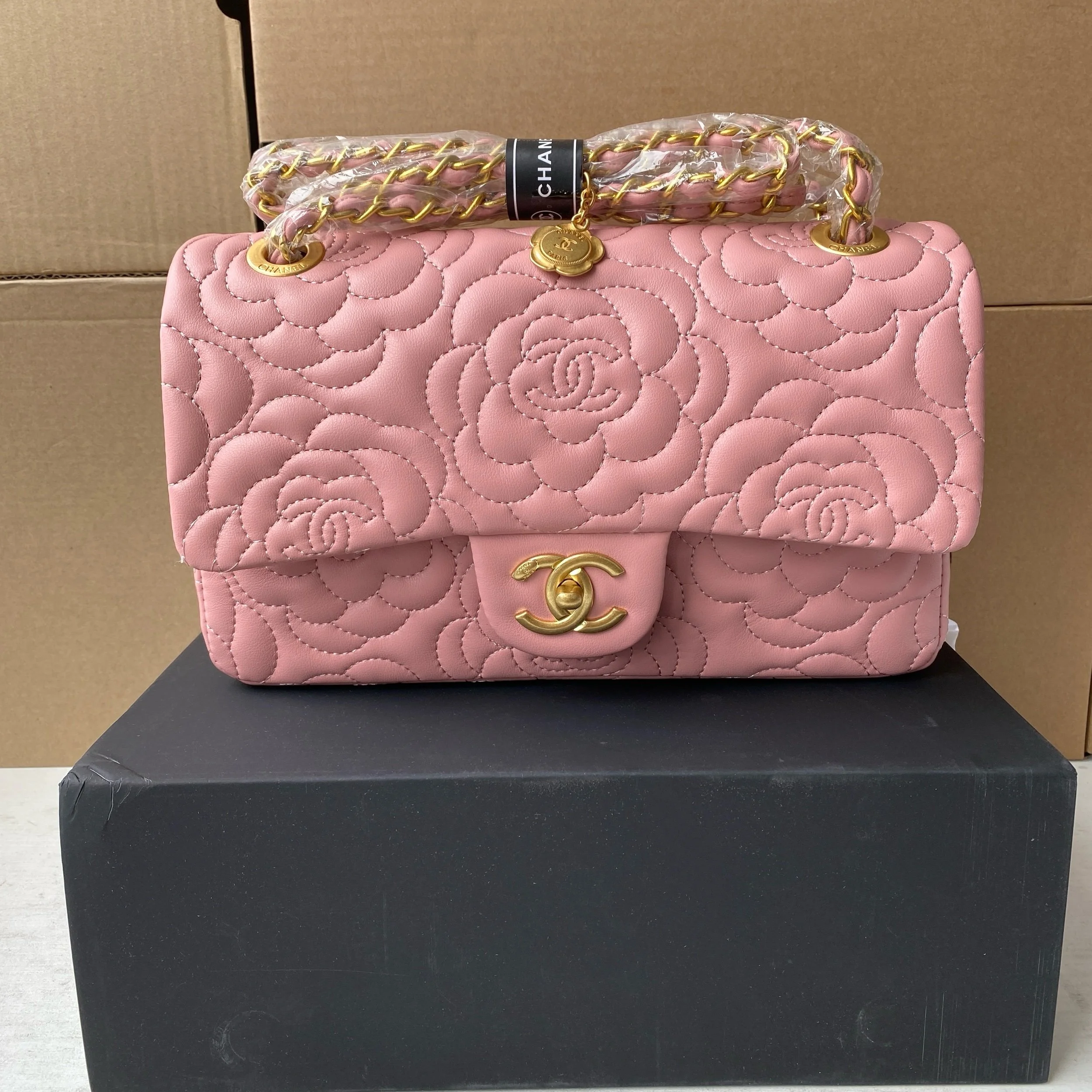 Beautiful VIP Chanel GWP Set featuring a double flap style bag, matching small crossbody, bracelet, and twilly. Please note this set is not a boutique retail bag and is being sold as a VIP / gift with purchase item. Gorgeous coordinated pieces with a timeless quilted look and elegant gold-tone accents.